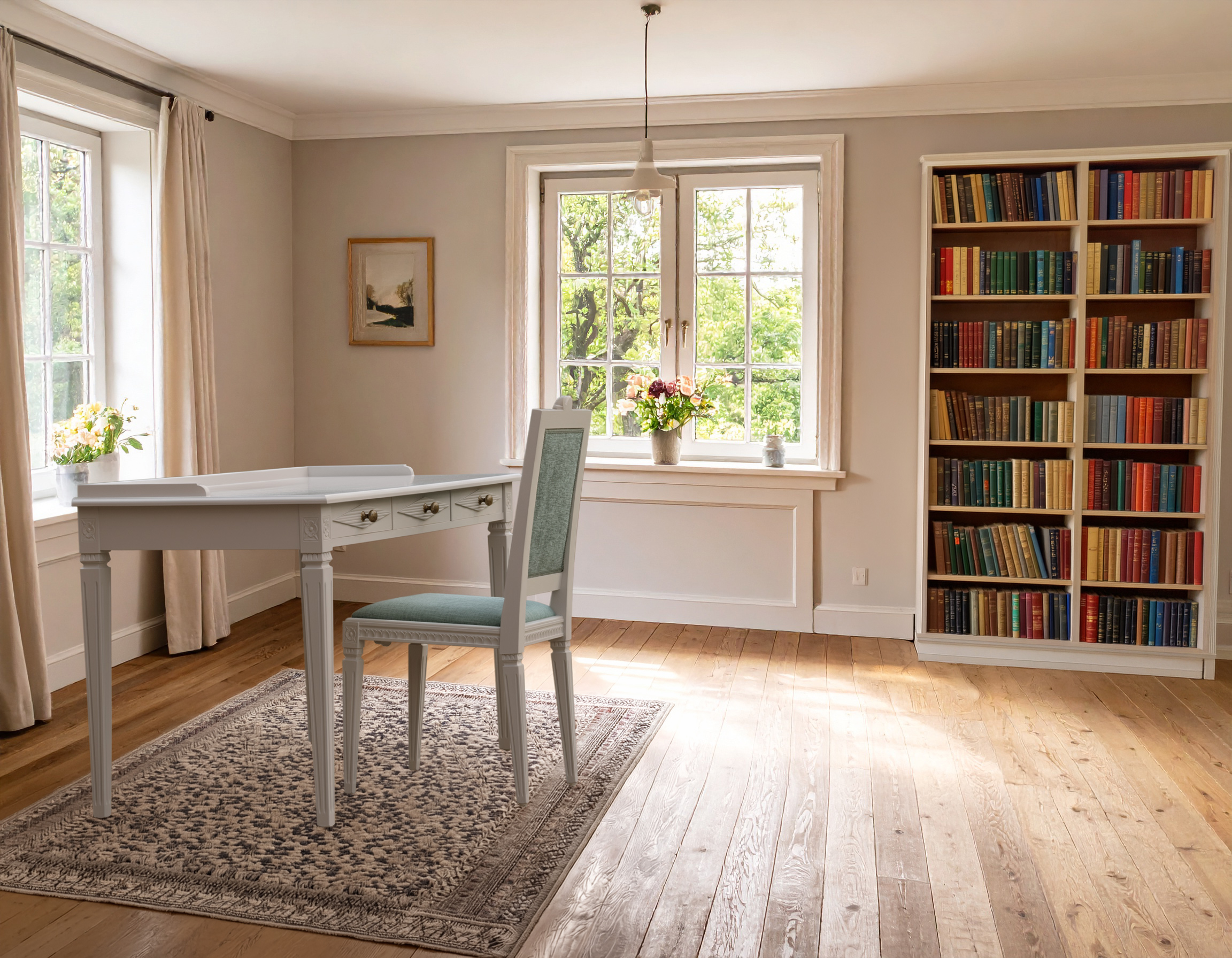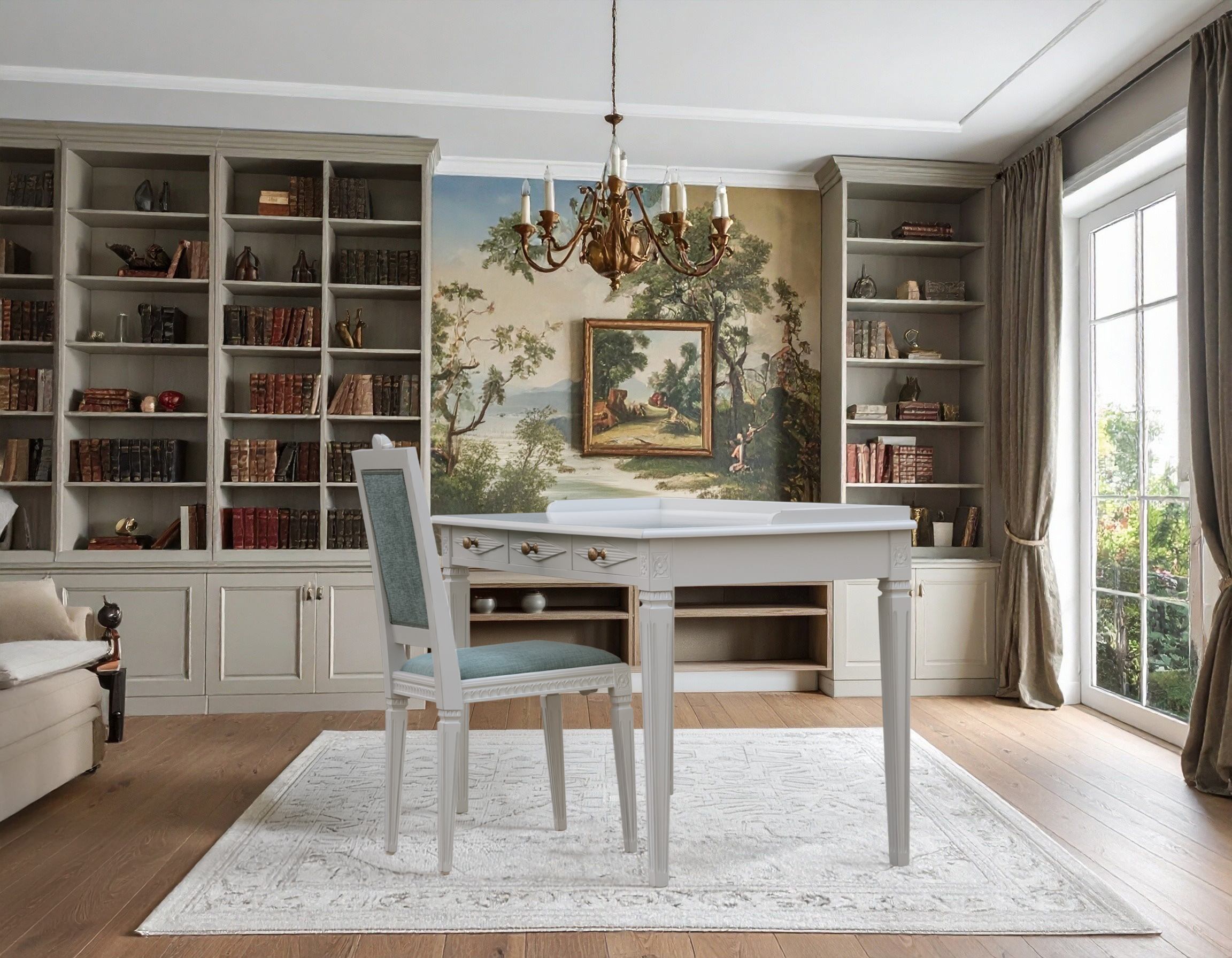 Gustavianskt skrivbord Rosenberg. En kund ville ha ett gustavianskt skrivbord med en klassisk stol, bordet var måttbeställt och dekorationen på lådorna skulle matcha dörrarna i rummet, längs baksidan och sidorna ville kunden ha en låg sarg på bordytan. Vi ritade ett förslag som kunden godkände.
